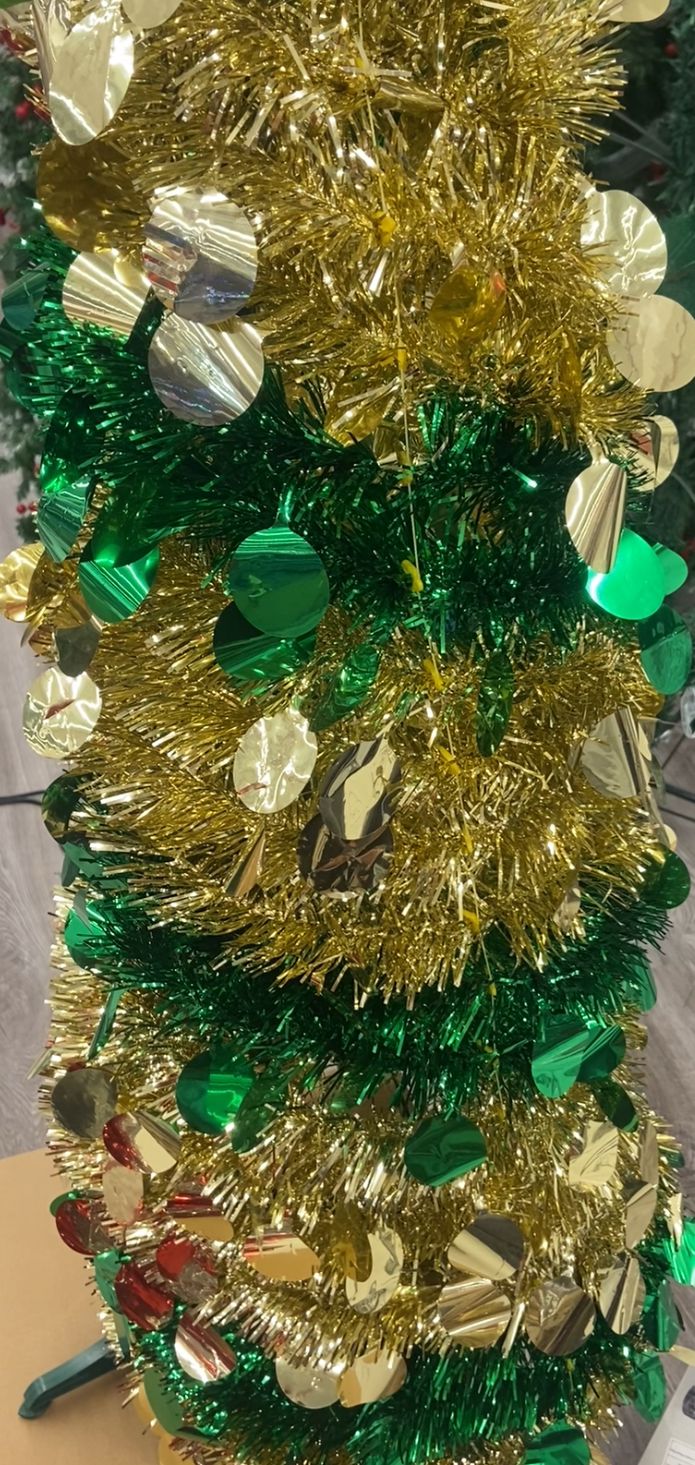 * Decoración Incluida: Viene elegantemente adornado con lentejuelas rojas vibrantes y una guirnalda de espumillón plateada, creando un contraste festivo y moderno.
