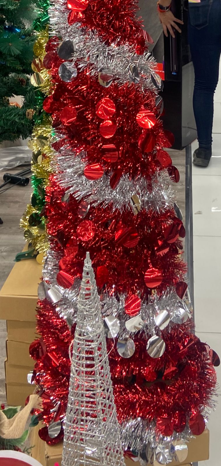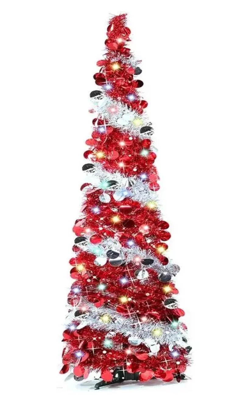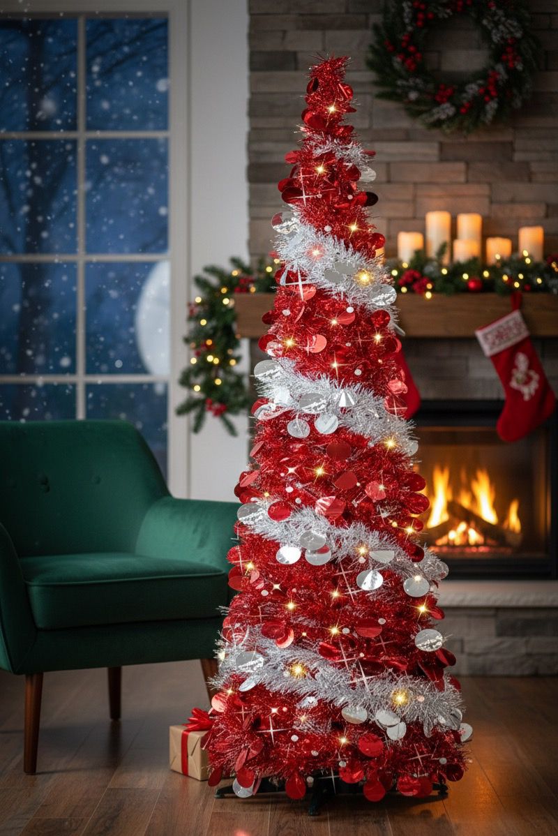 * Decoración Incluida: Viene elegantemente adornado con lentejuelas rojas vibrantes y una guirnalda de espumillón plateada, creando un contraste festivo y moderno.