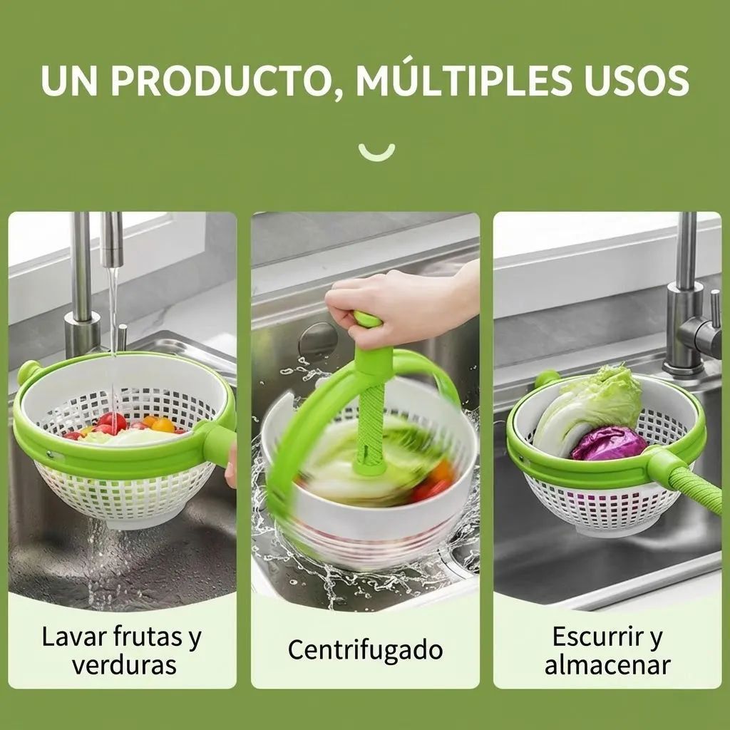 Funciona como colador y centrífuga de verduras o frutas directamente en el fregadero.