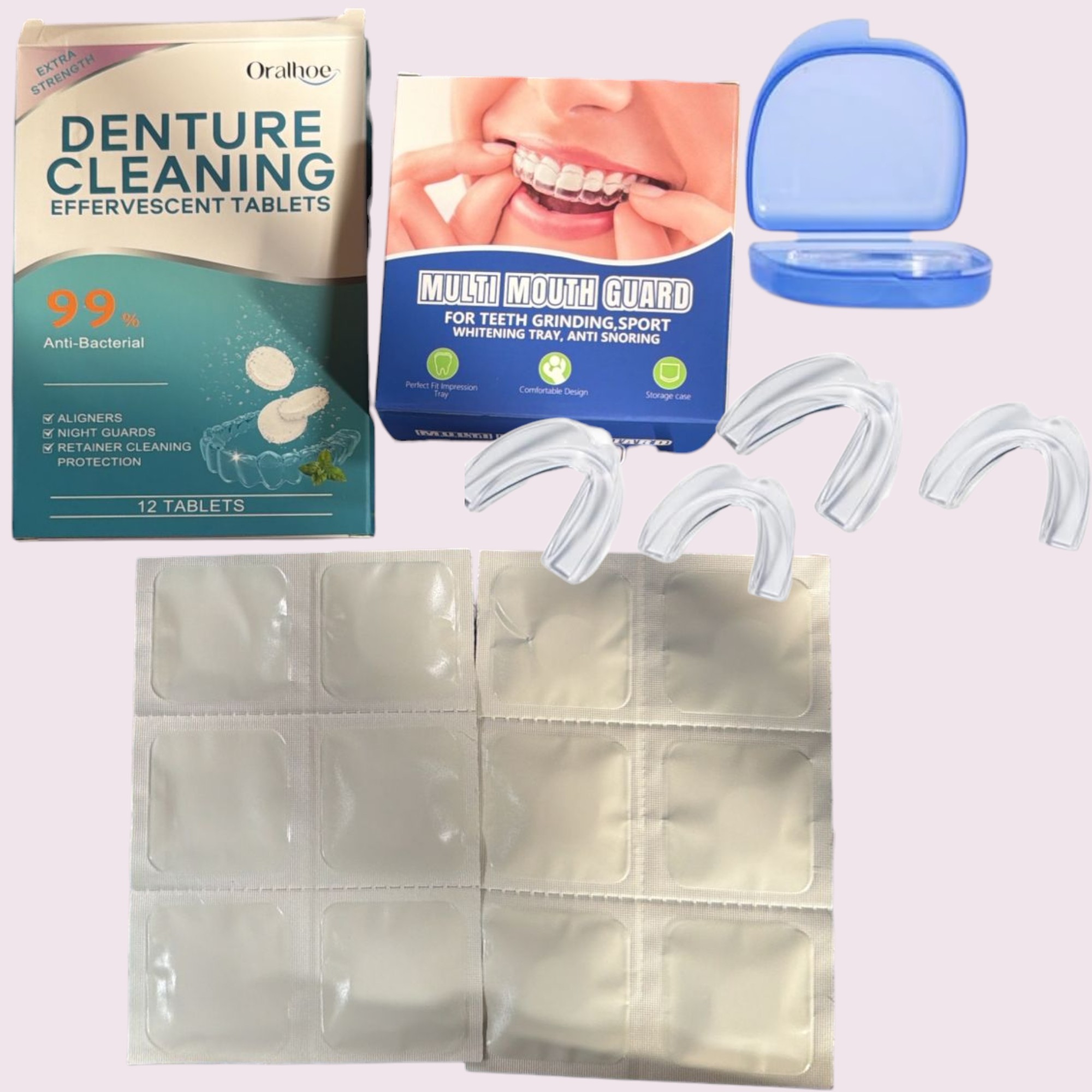 ✅ Combo que incluye tabletas efervescentes para limpiar dentaduras y protector bucal