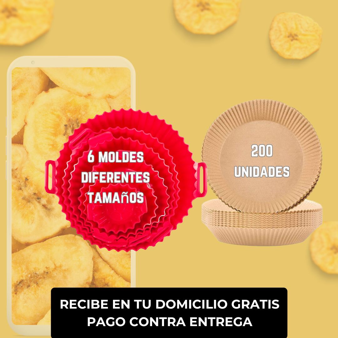 Son 200 papeles antiadherentes de 16 cm de ancho interno más 6 moldes de silicona de distintos tamaños para usar en la freidora de aire.