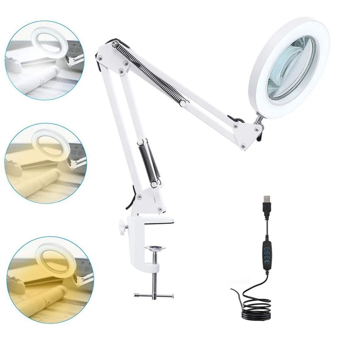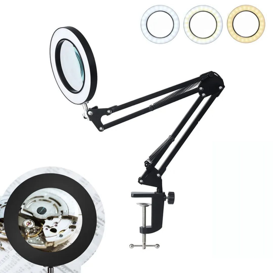 Diseño Ajustable: Cuenta con un brazo oscilante metálico con resortes que permiten posicionar la luz y la lupa con facilidad. Se asegura a la mesa mediante una abrazadera o pinza de metal resistente.
