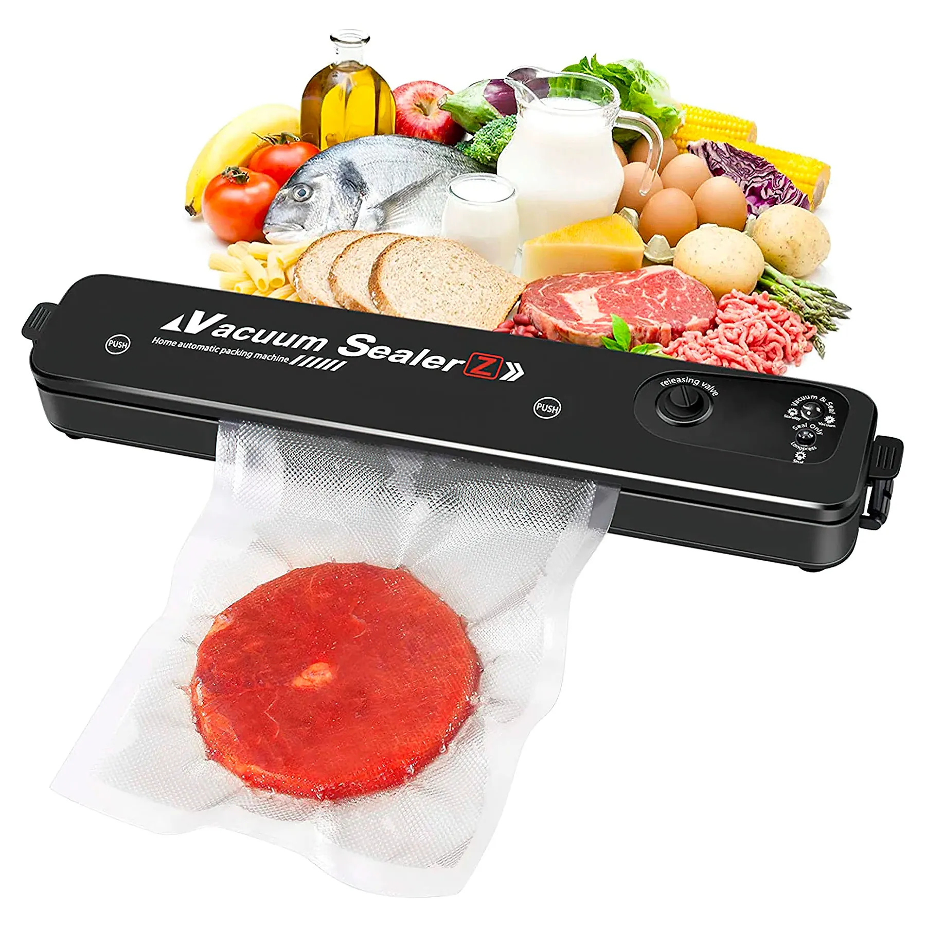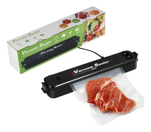 Características: Diseño compacto en color negro, apto para alimentos secos y húmedos, y suele incluir bolsas corrugadas especiales para el proceso.