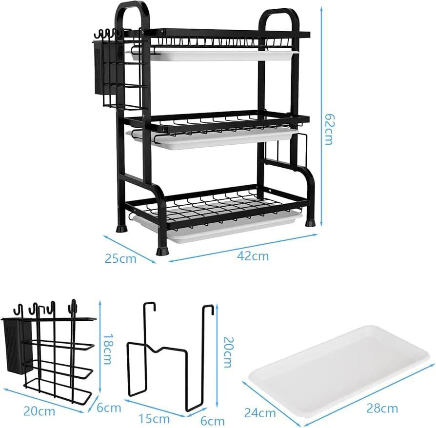 Sistema de Drenaje Eficiente: Cada nivel cuenta con su propia bandeja de goteo extraíble fabricada en material resistente. Esto evita que el agua caiga sobre los platos del nivel inferior o se acumule en la encimera, previniendo la formación de moho y garantizando una higiene total en tu cocina.