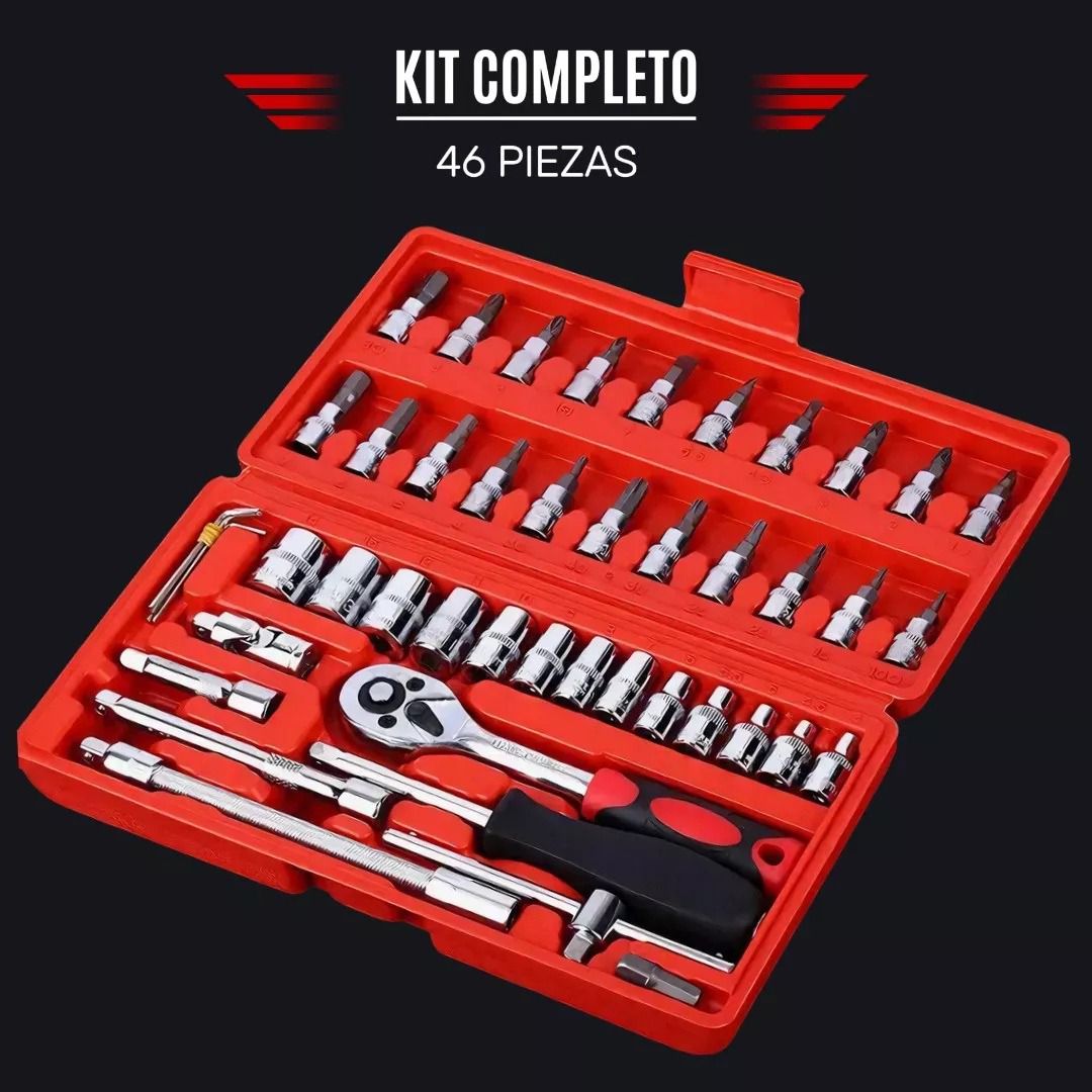 Enfréntate a cualquier reparación con total confianza con nuestro Set de Herramientas de 46 piezas, diseñado para ofrecer versatilidad, resistencia y precisión. Este kit es la solución perfecta para el mantenimiento de vehículos, motocicletas, bicicletas y para cualquier tarea de montaje o ajuste en el hogar.